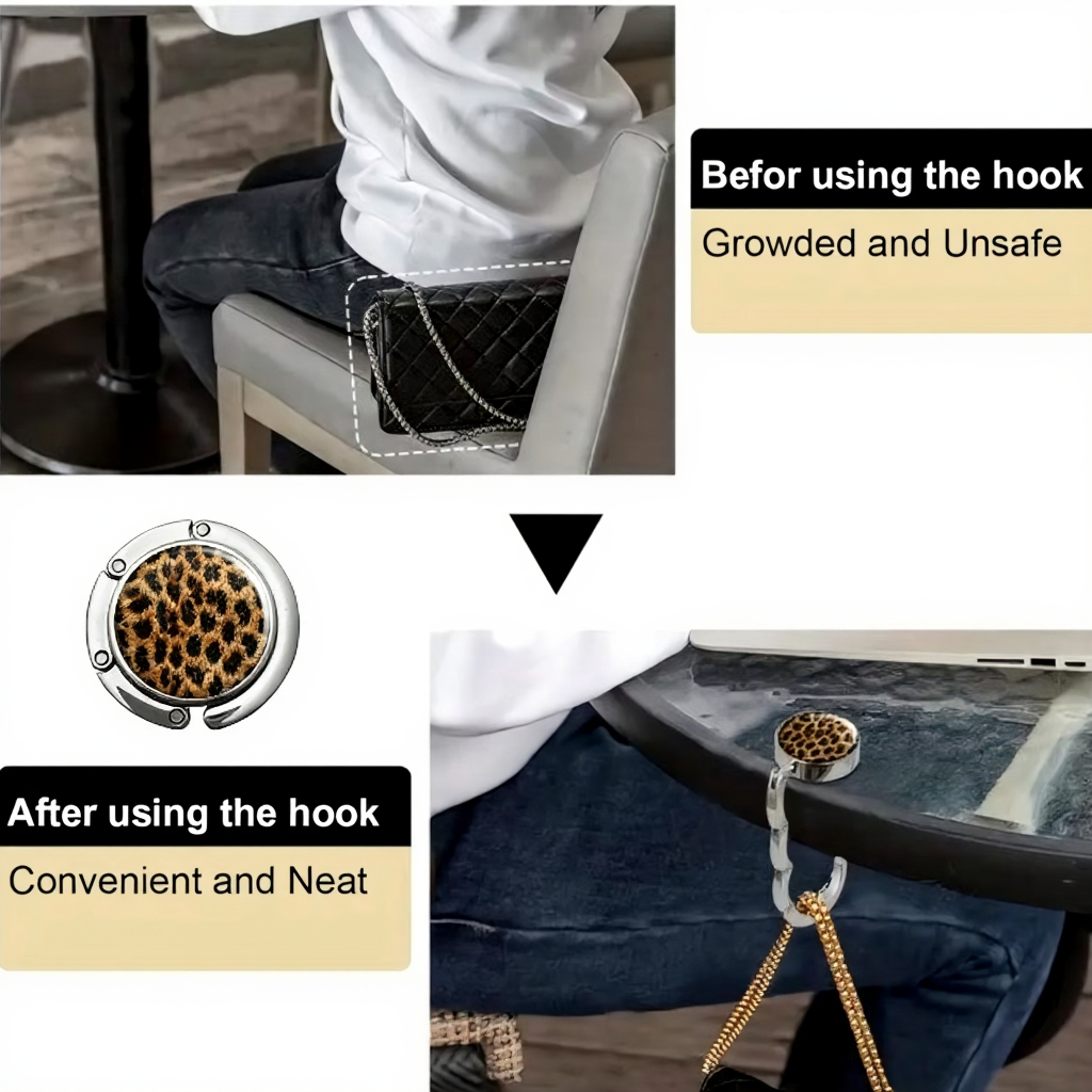 This foldable, elegant hook is your discreet daily ally, always ready when you need it.